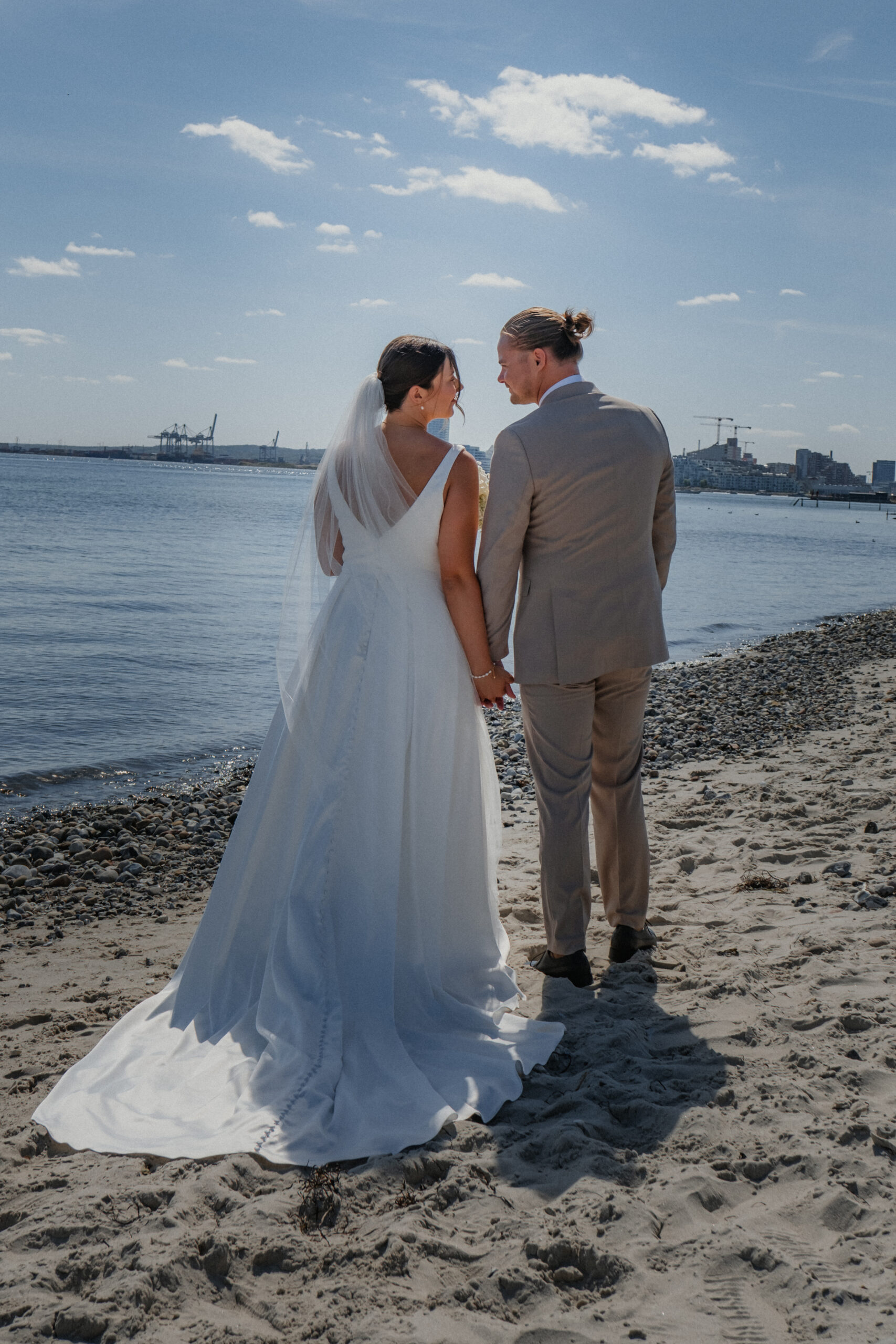 Therese og Mads blev viet en solskinsdag på stranden i Risskov. Havets brusen og den klare blå himmel dannede den smukkeste ramme om et lille, intimt bryllup, hvor kærligheden var i centrum. Med nære venner og familie samlet omkring dem sagde de ja til hinanden, og dagen blev fyldt med varme smil, glædestårer og øjeblikke, der vil blive husket for altid.